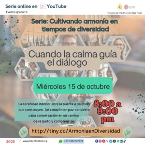 15 miércoles 8:00 a 9:00 pm ONLINE Serie Armonía en tiempos de diferencia 3- Cuando la calma guía el diálogo LINK: http://tiny.cc/ArmoniaenDiversidad |