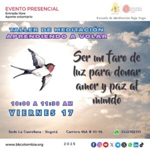17 viernes 10:00 a 11:30 am Taller de meditación Aprendiendo a volar: Ser un faro de luz para donar amor y paz al mundo |