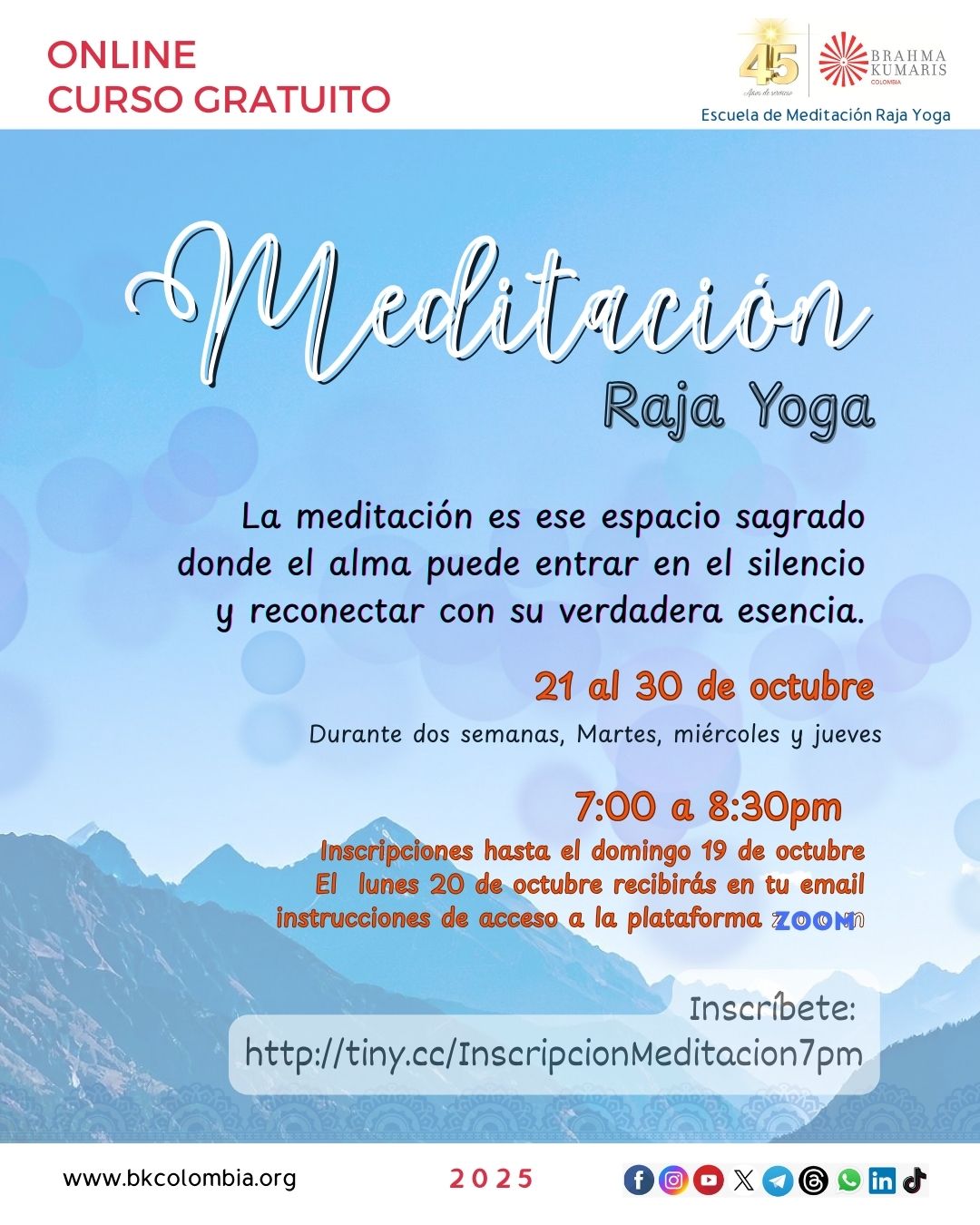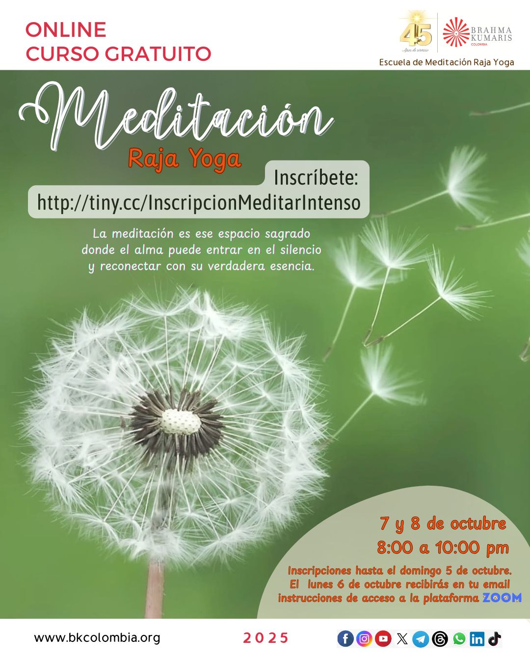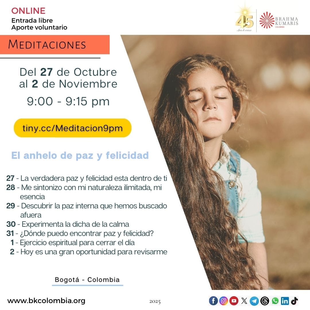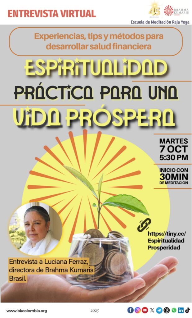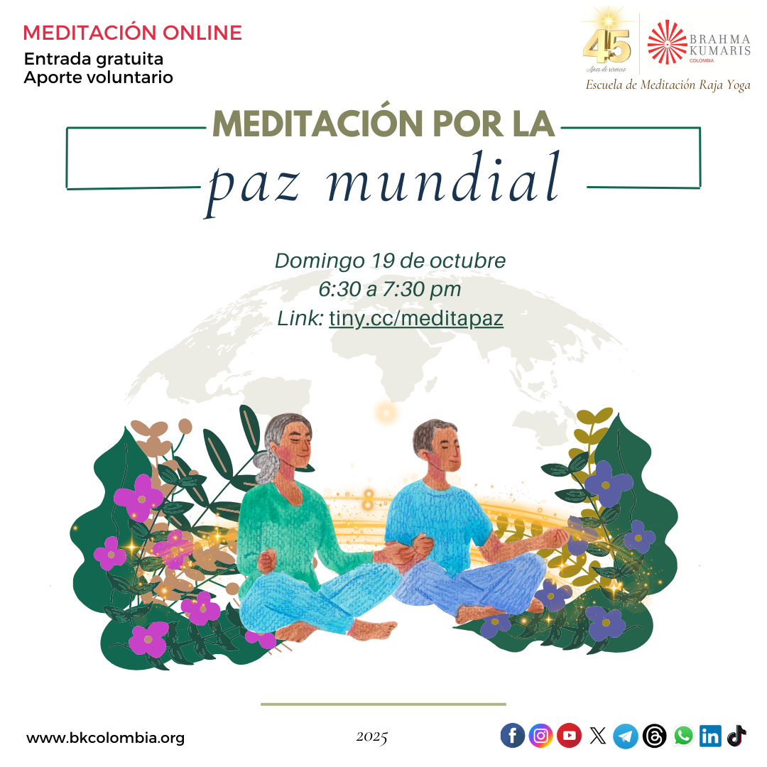 7 martes 6:00 a 7:00 pm Entrevista ONLINE: Espiritualidad práctica para una vida prospera con BK Luciana coordinadora de BK Brasil LINK: http://tiny.cc/EspiritualidadProsperidad 7 martes y 8 miércoles, 8:00 a 10:00 pm Curso ONLINE básico de Meditación Raja Yoga Inscripciones hasta el domingo 5 de octubre. El lunes 6 de octubre recibirás en tu email instrucciones de acceso a la plataforma ZOOM Link de inscripción: http://tiny.cc/InscripcionMeditarIntenso |