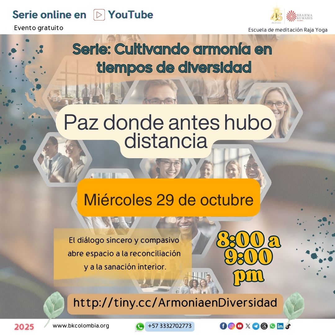 29 miércoles 8:00 a 9:00 pm ONLINE Serie Armonía en tiempos de diferencia 5- Paz donde antes hubo distancia LINK: http://tiny.cc/ArmoniaenDiversidad |