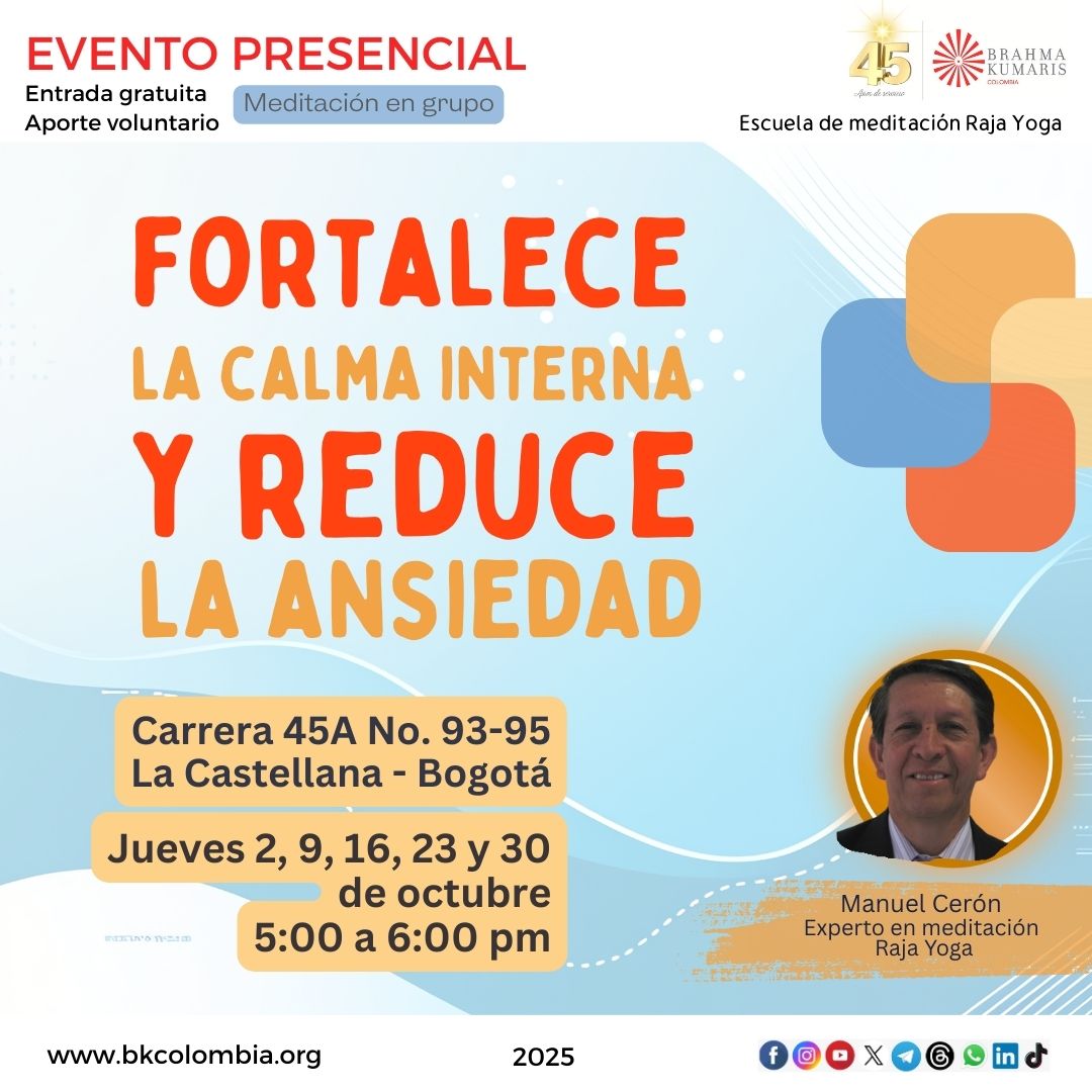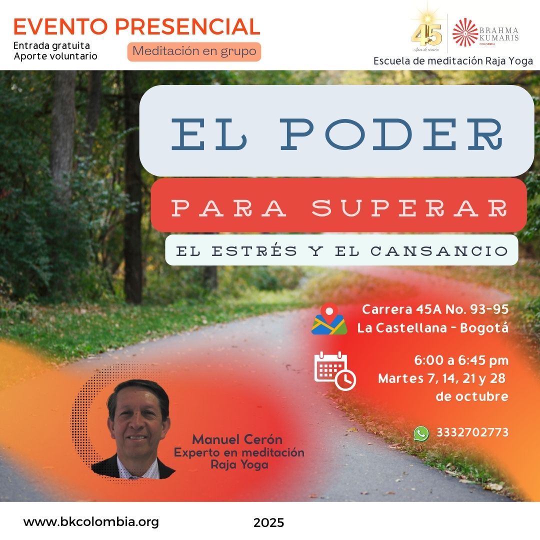 21 al 30, Curso ONLINE básico de Meditación Raja Yoga durante dos semanas martes, miércoles y jueves. 7:00 a 8:30 pm Inscripciones hasta el domingo 19 de octubre. El lunes 20 de octubre recibirás en tu email instrucciones de acceso a la plataforma ZOOM LINK de inscripción: http://tiny.cc/InscripcionMeditacion7pm 21 martes 6:00 a 6:45 pm Meditación guiada El poder para superar el estrés y el cansancio |