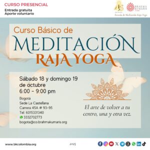 18 sábado y 19 domingo 6:00 a 9:00 pm Curso Básico de Meditación Raja Yoga |