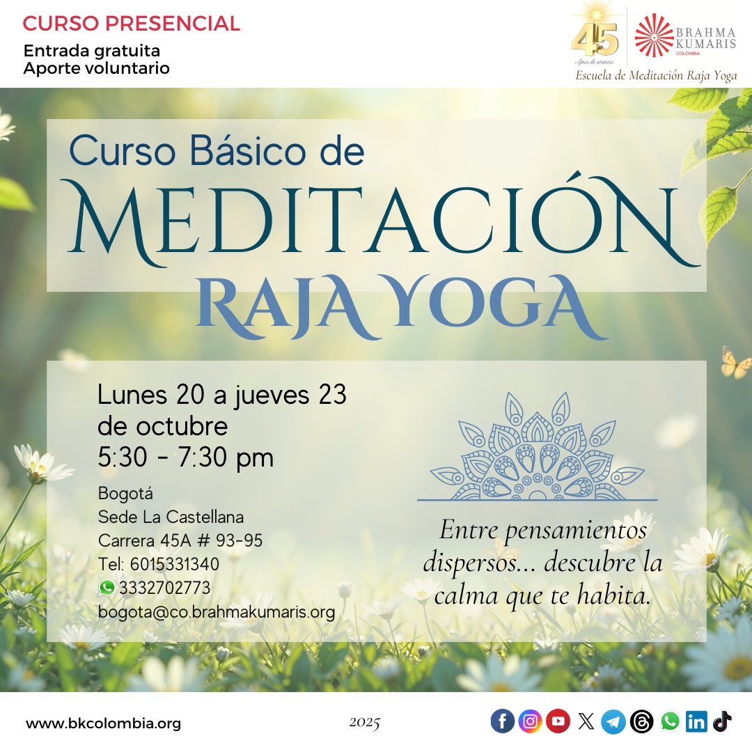 20 lunes a 23 jueves 5:30 a 7:30 pm Curso Básico de Meditación Raja Yoga |