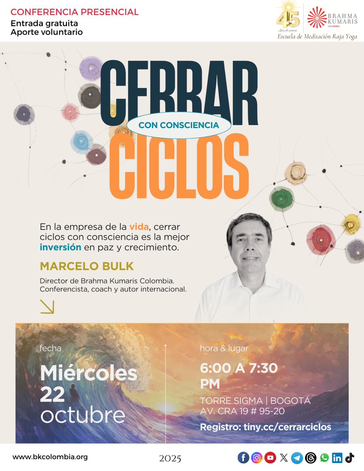 22 miércoles, 6:00 a 7:30 pm Conferencia Cerrar ciclos …con consciencia Presencial Torre Sigma Av. Cra 19 # 95-20 LINK de inscripción: http://tiny.cc/cerrarciclos |