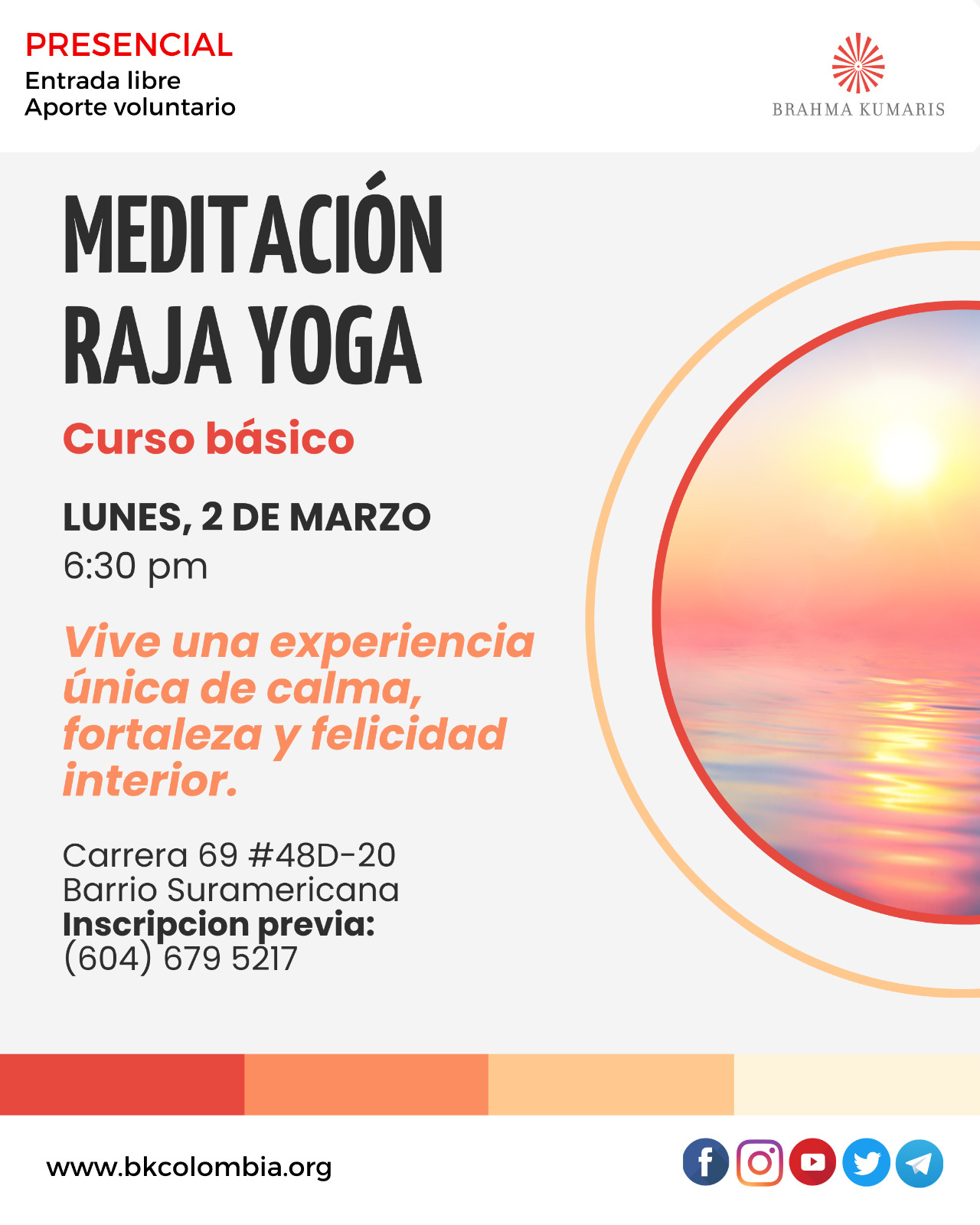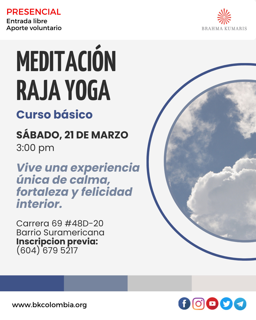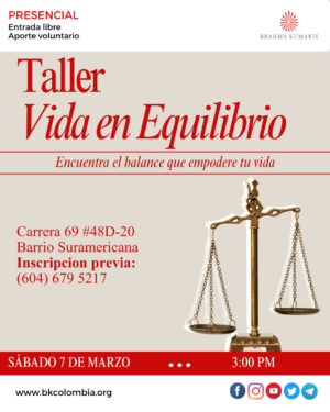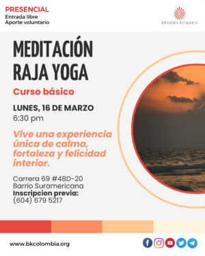 by Brahma kumaris Co 3 marzo, 2026 Antioquia, Medellín Carrera 69 #48D-20 Barrio Suramericana Teléfono +57 6046795217 email: medellin@co.brahmakumaris.org 2 lunes, 6:30 pm Meditación Raja Yoga 7 sábado, 3:00 a 5:30 pm Taller: Vida en equilibrio 14 sábado, 3:00 a 5:30 pm Taller: Cómo sanar tu mente 15 domingo, 6:30 a 7:30 pm Meditación por la Paz Mundial 16 lunes, 6:30 pm Meditación Raja Yoga 21 sábado, 6:30 pm Meditación Raja Yoga Comparte esto: Compartir en X (Se abre en una ventana nueva) X Comparte en Facebook (Se abre en una ventana nueva) Facebook Compartir en LinkedIn (Se abre en una ventana nueva) LinkedIn Compartir en WhatsApp (Se abre en una ventana nueva) WhatsApp Me gusta esto:Me gusta Cargando... Tags: cursos de meditacion, taller calidad de vida Share Sede La Castellana Bogotá – Marzo 2026 Día internacional de la mujer – Marzo 8 – Celebración Post a CommentTu dirección de correo electrónico no será publicada. Los campos obligatorios están marcados con * Guarda mi nombre, correo electrónico y web en este navegador para la próxima vez que comente. Recibir un correo electrónico con cada nueva entrada.Publicar el comentario Δ Este sitio usa Akismet para reducir el spam. Aprende cómo se procesan los datos de tus comentarios.